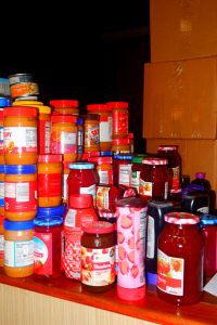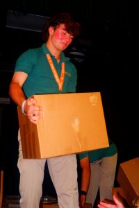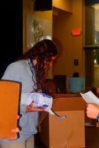 Participants have already picked up boxes from the cafeteria which features the required list of items, done the shopping, and returned the boxes with everything inside.