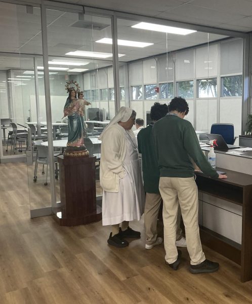 Sister Teresa helps juniors Vittorio Buttice and Joshua Rocha with a journalism project. (Violeta Fausciana)