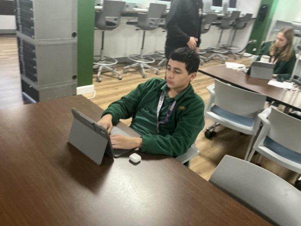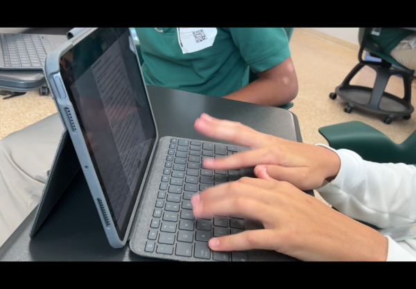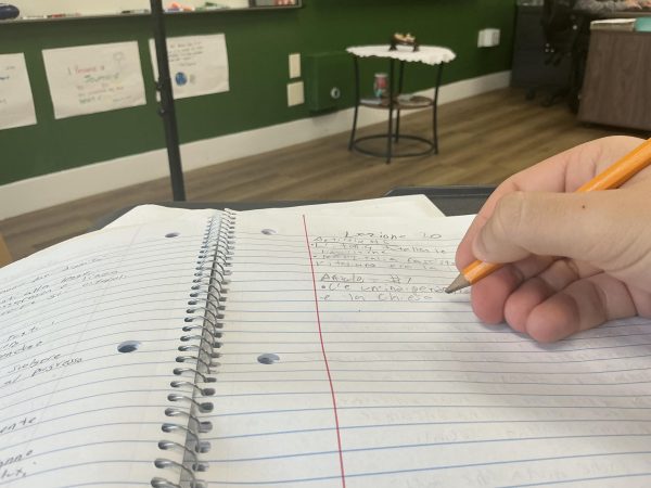 This empty school hallway early morning during E block in the science building captures an area which is usually filled with noise (Matteo Cupello)A student works alone during E block in the SLC. The lack of movement and interacting with others furthers the theme of silence (Matteo Cupello)A student hand-writes in a notebook. (Matteo Cupello)A student turns a page in a book during class. (Matteo Cupello)A student types out an assignment during class time. (Matteo Cupello)