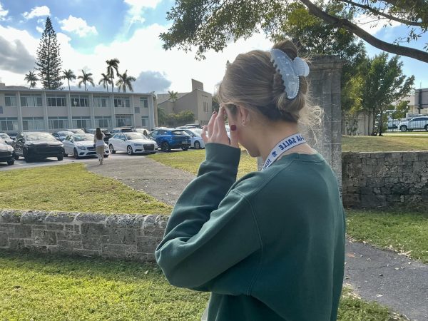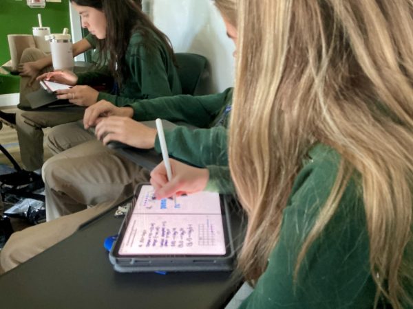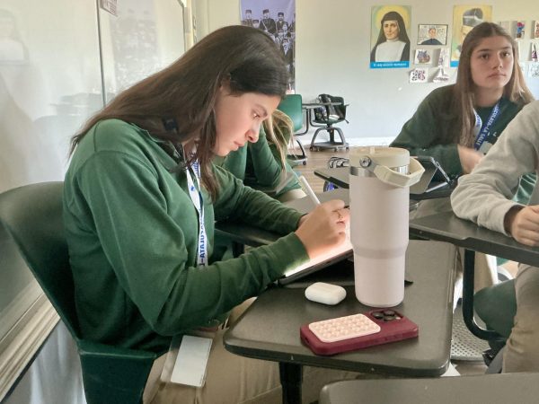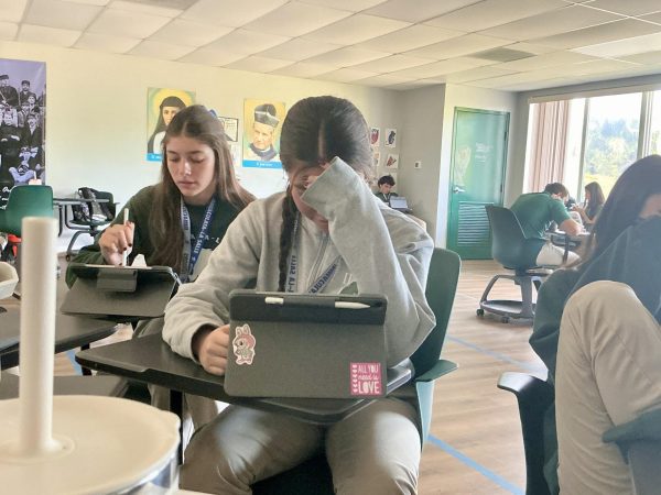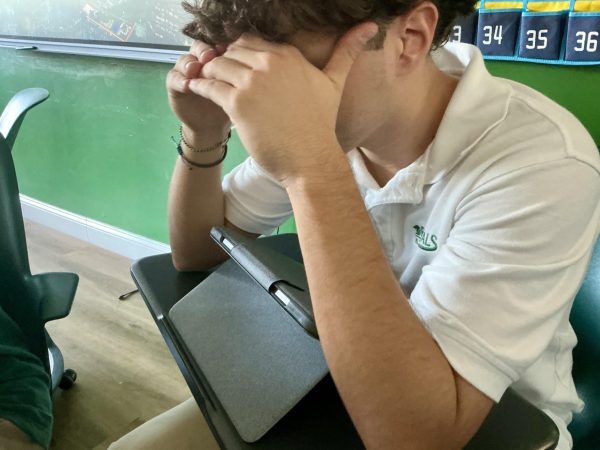 Student Luciana Gadala-Maria, junior, adjusts her hair near the parking lot as she prepares to head to her next class. (Jala Tabraue)Junior Gabriela Punzo writes on her tablet during a calm classroom work session. (Jala Tabraue)Martina Welch, junior, takes notes on her iPad during class, staying focused while classmates work nearby. (Jala Tabraue)Maximo Biasutto, junior, rests his head in his hands at his desk, showing the pressure students can feel during class time. (Jala Tabraue)Student Valentina Esperante, junior, works independently on her iPad during class while other students focus in the background. (Jala Tabraue)
