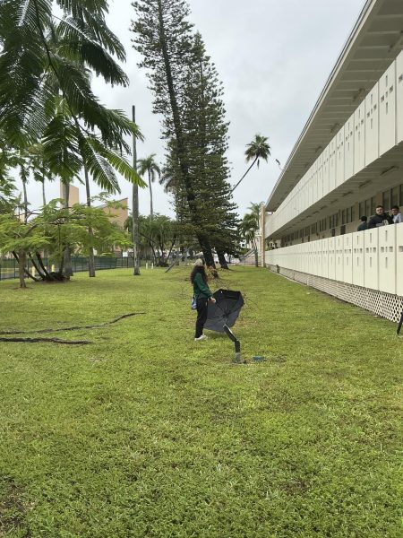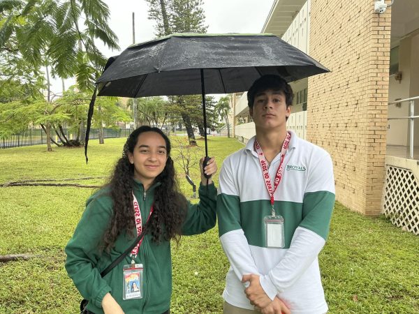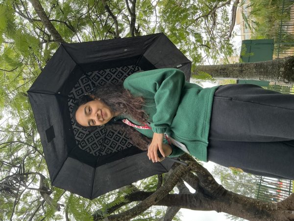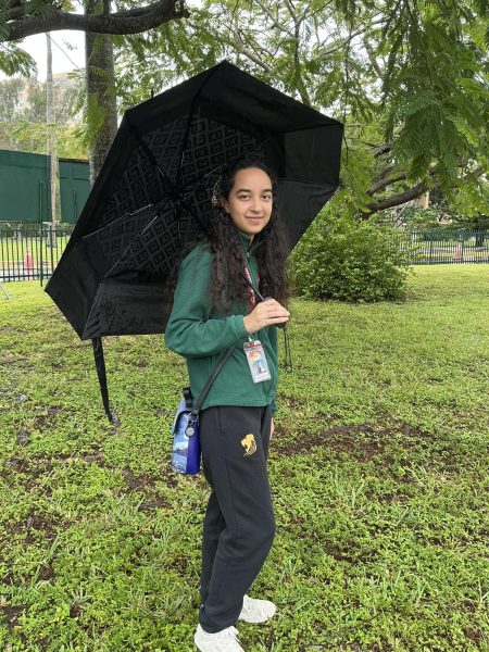The camera looks up as senior Clara Custodio shields herself from inclement weather. (Sienna Daughton-Weill)Clara walks through the frame in a full, long shot, grounded in her environment. (Sienna Daughton-Weill)Clara’s eyes focus in a close-up, revealing quiet concentration. (Sienna Daughton-Weill)Shadows surround Clara in the low lighting. (Sienna Daughton-Weill)The full frame captures Clara moving through the space. (Sienna Daughton-Weill)Seniors Clara Custodio and George Mavris do their best to avoid the drizzle. (Sienna Daughton Weill)
