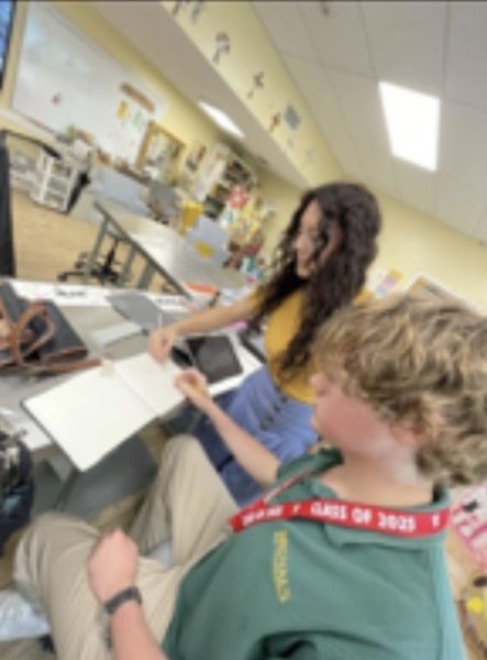 Ms. Cristina Ramirez takes creative writing students Lucia Fink and Victoria Caicedo through the nature trail.